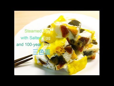 層層依序鋪上皮蛋和鹹蛋,最後倒入蛋白。